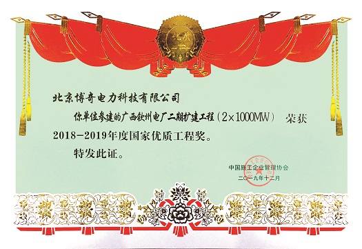 2019年12月,廣西欽州電廠二期擴(kuò)建工程(2×1000MW)榮獲2018-2019年度國家優(yōu)質(zhì)工程獎(jiǎng)。