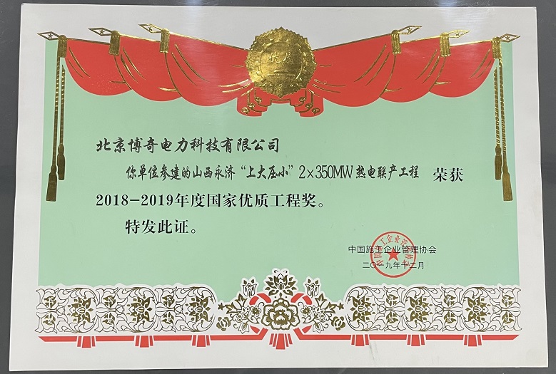 2019年12月,山西永濟(jì)"上大壓小"2×350MW熱電聯(lián)產(chǎn)工程榮獲2018-2019年度國家優(yōu)質(zhì)工程獎(jiǎng)。
